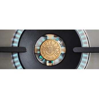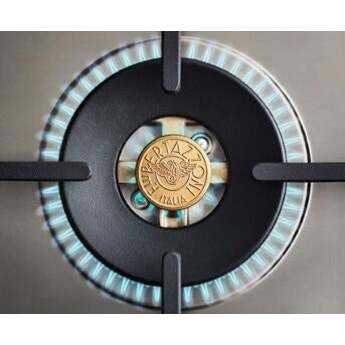 The high-efficiency maintop with 6 brass burners and electric griddle features 2 dual ring 19,000 BTU power-burners that boil water in under 6 minutes (best in class), and 4 additional MonoBloc burners of variable size and power to suit every style of cooking, with delicate simmer at 750 BTUs. The stainless steel griddle with integrated cover provides additional cooking options.