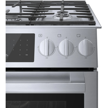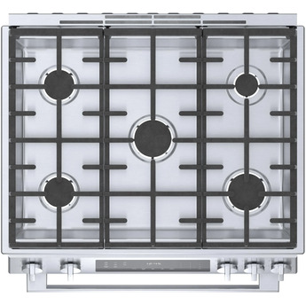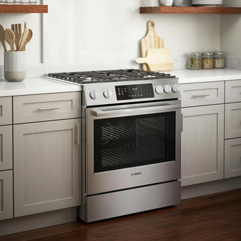 The Bosch Stainless Steel Helps Guard Against Scratches and Fingerprints. The Full-depth Gas Slide-in Range Fits into Any Freestanding Range Cutout, and Features Five Burners to Cook More Dishes at Once.