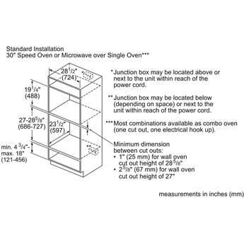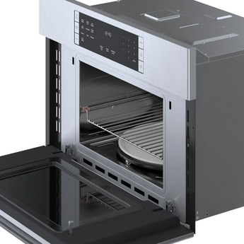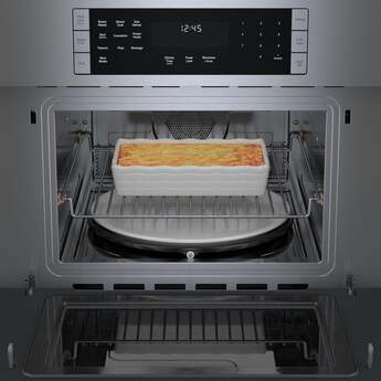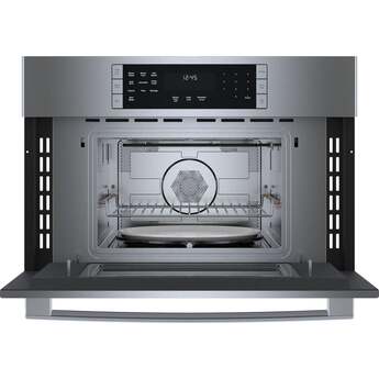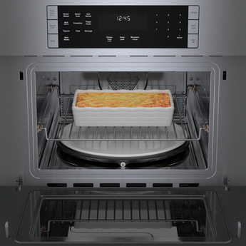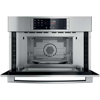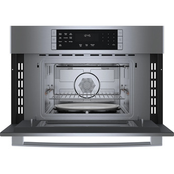 Pair the speed and convenience of microwave cooking with the quality of genuine convection baking in one unit with this Bosch HMC80152UC 800 30" Stainless Steel Electric Single Combo Wall Oven-Convection-Speed Oven. Designed to install flush with cabinetry, it pairs perfectly with Bosch wall ovens, steam Ovens, and warming drawers. It mounts easily with wall or under counter installation. Designed in stainless steel with a metal and ceramic turntable inside, this wall oven is designed to stand up to years of use.
