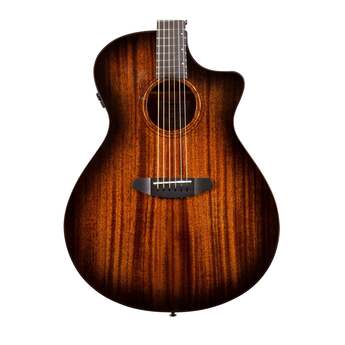 As exotic tonewoods go, solid African mahogany is one of the greats. Visually, its straight grain is clean, alluring, and warm, with a rich, inviting sound that matches the look. Its largest body shape, the Breedlove Wildwood Pro Concerto Suede CE African Mahogany Acoustic Guitar has mahogany top rings, excellent note separation, and a strong midrange presence despite the power and volume of the instrument. As an alternative to the ubiquity of spruce, all mahogany instruments provide a thrilling change of pace, especially for artists looking to expand their sound or distinguish themselves. Balance big and bold sounds with the warmth and definition of mahogany with a soft cutaway Wildwood Pro Concerto Suede CE. With stage-ready Fishman Flex Plus-T electronics and a gig bag, this guitar will take you as far as your talent and hustle can take you.