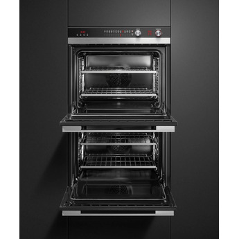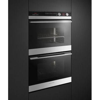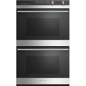 The Fisher Paykel OB30DDEPX3 N Contemporary 30'' 8.2 cu. ft. Brushed Stainless Steel and Black Glass Electric Double Oven with 11 Functions is sure to delight any cooking enthusiast. It comes with 11 functions with pre-set temperatures, which grants owners various cooking styles to experiment with. Its self-cleaning feature uses heat to break down food residue, so the user only needs a damp cloth to clean it. This oven's control panel key lock guards against unauthorized use as well.