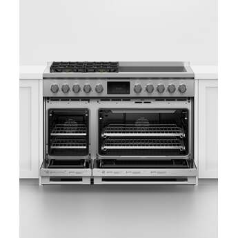 This range has craftsmanship in every detail, with real stainless steel, cast-iron trivets, and beautifully weighted, halo illuminated dials. Each cavity features incandescent lights and full extension telescopic racks. From the robust legs to the powerful cooktop, this Range is built to last.