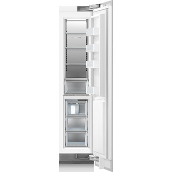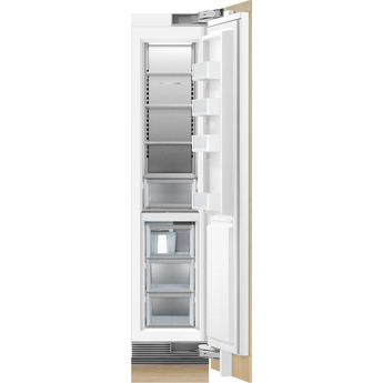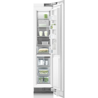 Standing 84 inches high, the Fisher-Paykel-RS1884FRJK1 Integrated 18" 7.8 cu. Ft. Custom Panel Built-In Column Freezer with Stainless Steel Interior - Right Hinge, Energy Star model is a slender yet spacious option for storing frozen foods in convenient and thoughtfully organized ways. There are three possible freezing levels, ranging from soft freeze to deep freeze. These options allow keeping food in the best possible state for long-term freshness and great taste. The glass shelves also combine nicely with the metal interior.