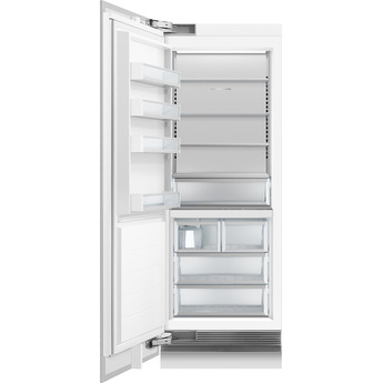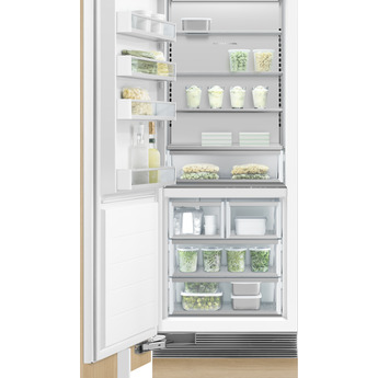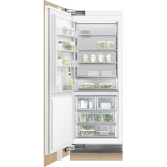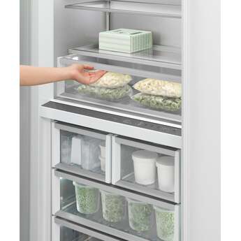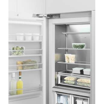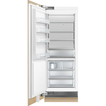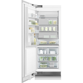 Dual-zone and electric, the 115-volt Fisher-Paykel-RS3084FLJ1 Integrated 30" 15.6 Cu. Ft. Custom-Panel Built-In Column Freezer with White Steel Interior - Left Hinge, Energy Star offers LED lighting and intelligent cooling/defrost. Plus, there are three different cooling modes; freeze, soft freeze and deep freeze, to meet your needs. Adapt this Energy Star built-in to your needs via the glass cantilever shelving and door bins, knowing that its certified ActiveSmart system is on patrol, using cooling and defrosting (frost-free) only when necessary, reducing energy consumption (and electricity bills!). A door alarm and fast-freeze multiply the goodness of this compact cooler.