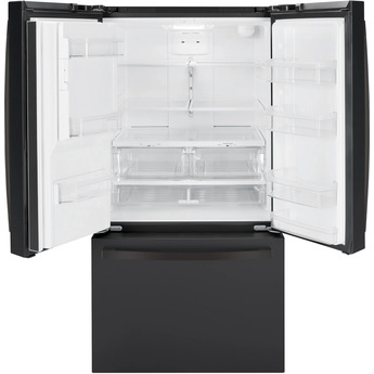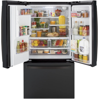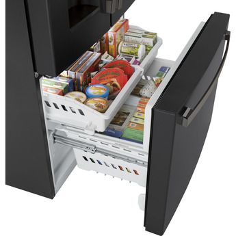 Due to its external, door-mounted ice maker, the GE-GFE26JEMDS Black Slate 25.6 Cu. Ft. Capacity French Door Refrigerator - Energy Star model offers accessible convenience without taking up space inside the appliance. The interior is roomy enough to accommodate approximately 26 bags of groceries, making it large enough for several weeks' worth of food. There are two humidity-controlled doors designed for keeping produce fresh, plus a full-width drawer that keeps snacks within easy reach.