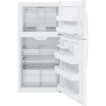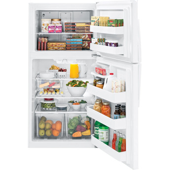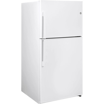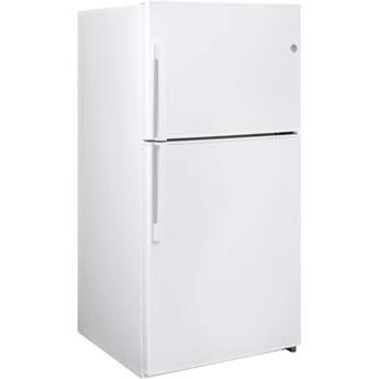 The GE-GTE21GTHWW 33" 21.2 cu. ft. White Top Freezer Refrigerator - Energy Star is a one-stop shop for your family's snack and meal needs. This attractive appliance features ample storage room from top to bottom including two shelves of freezer space plus door storage. Deep crispers keep your fruits and vegetables fresh, dairy products get their very own section while gallon items fit comfortably in the side compartment. It's adjustable, spill resistant shelves and easy to use temperature controls make this kitchen companion a must have.
