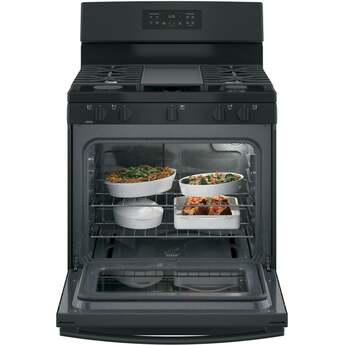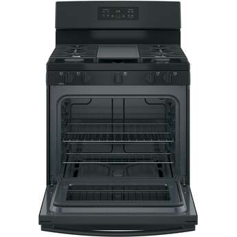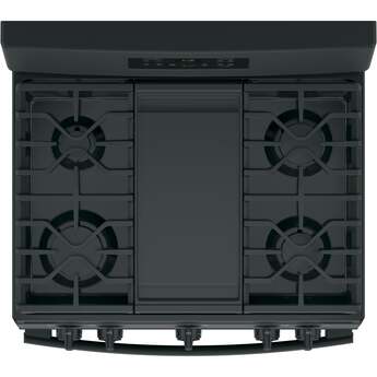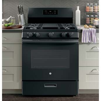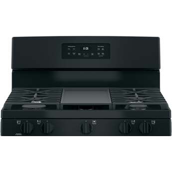This 30-inch free-standing gas range features a 4-burner cooktop and griddle. The precise simmer burner is ideal for gentle, perfect simmering while the 15,000 BTU burner delivers a wide range of heat output. The extra-large integrated non-stick griddle allows you to cook up to six grilled cheeses at once. Sealed cooktop burners contain spills, making cleaning quick and easy.The deep-recessed cooktop contains spills, making cleaning a breeze. The 5.0 cu. ft. sized oven gives you enough room to cook an entire meal at once. The broiler drawer allows for flexible usage as it can accommodate any sized pan.