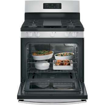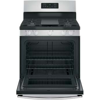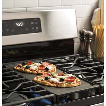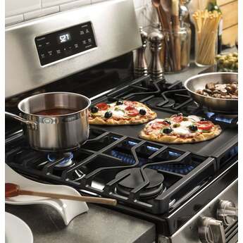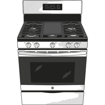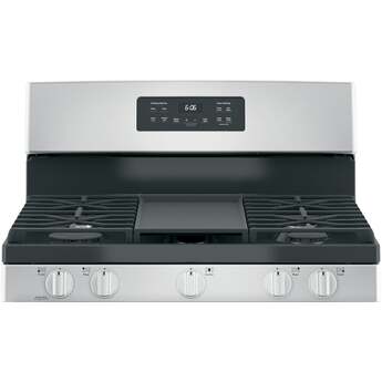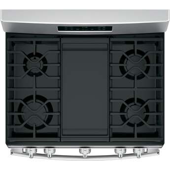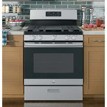 This 30-inch free-standing gas range features a 4-burner cooktop and griddle. The precise simmer burner is ideal for gentle, perfect simmering while the 15,000 BTU burner delivers a wide range of heat output. The extra-large integrated non-stick griddle allows you to cook up to six grilled cheeses at once. Sealed cooktop burners contain spills, making cleaning quick and easy.The deep-recessed cooktop contains spills, making cleaning a breeze. The 5.0 cu. ft. sized oven gives you enough room to cook an entire meal at once. The broiler drawer allows for flexible usage as it can accommodate any sized pan.