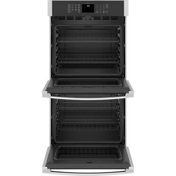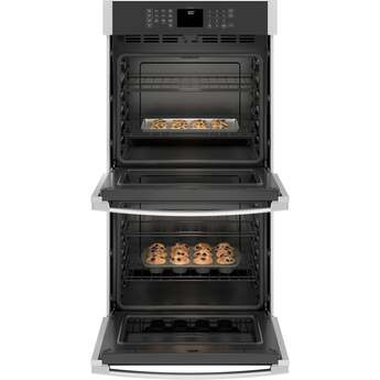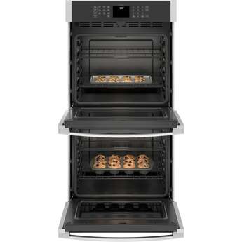 This built-in double wall oven by GE has 8.6 cu. ft. total capacity and features self-clean with steam clean option, glass touch controls, sabbath mode, electronic clock and ktichen timer, and WiFi Connectivity.