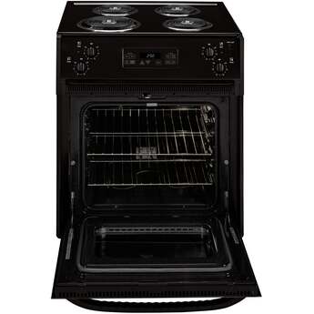 • Coil Cooktop, 4 Elements, 3 cu. ft. Total Oven Capacity, Delay Bake, Self-Clean Oven, ADA Compliant, Self-Clean Oven, Chrome Drip Pans in Black