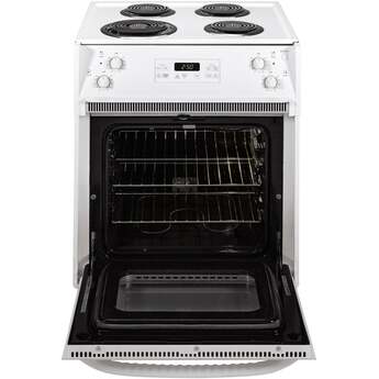 • Coil Cooktop, 4 Elements, 3 cu. ft. Total Oven Capacity, Delay Bake, Self-Clean Oven, ADA Compliant, Self-Clean Oven, Chrome Drip Pans in White