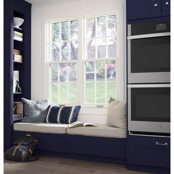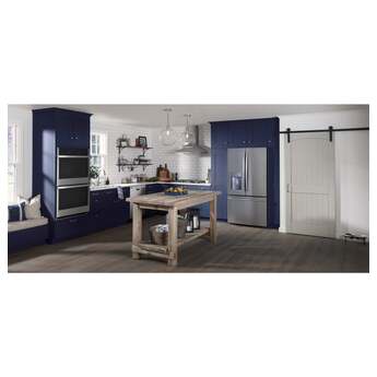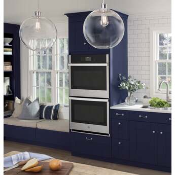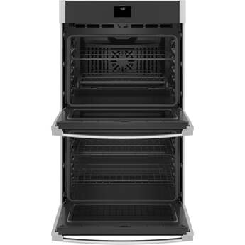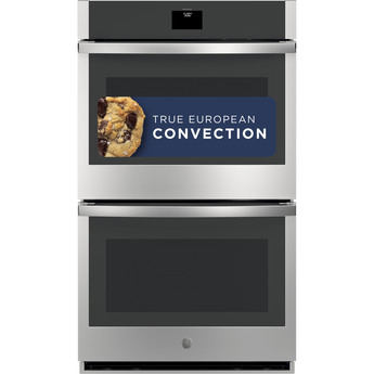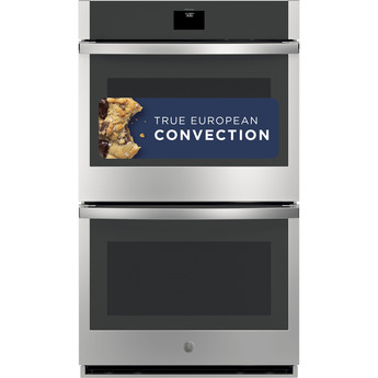 This 30" Electric Double Wall Oven from GE offers 10 cu. ft. of total capacity. The oven features True European Convection which utilizes a convection fan and a third heating element for faster cooking. The unit also features a hidden backlit LCD control panel, precision temperature probe and self-clean with steam clean.