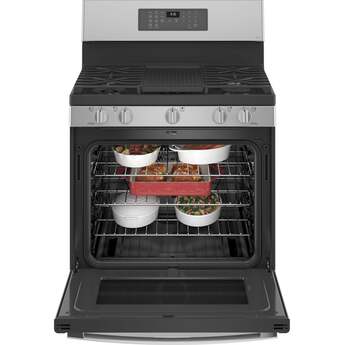 • Natural Gas, 5 Sealed Burners, Grill, Griddle, Wi-Fi Enabled, 5.4 cu. ft. Total Oven Capacity, Convection Oven, Continuous Grates, Self-Cleaning Mode, Viewing Window, Convection Cooking, Sealed Cooktop Burners, Baking Drawer, Tri-Ring Burner in Stainless Steel