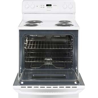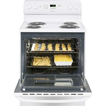 Bake delightful pastries with this freestanding Hotpoint electric range. Its two oven racks accommodate a variety of cookware in six different positions to provide flexibility, and the four cooktop coil elements let you prepare dishes simultaneously. An audible preheat signal, auto shutoff and electronic timer make this 30-inch Hotpoint electric range a functional addition to your kitchen.