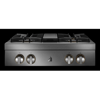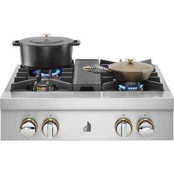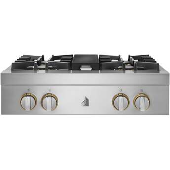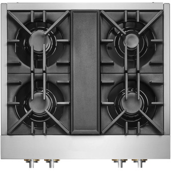 - 4 Sealed Burners, Cast Iron Grates, Halo-Effect Knobs in Stainless Steel