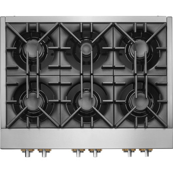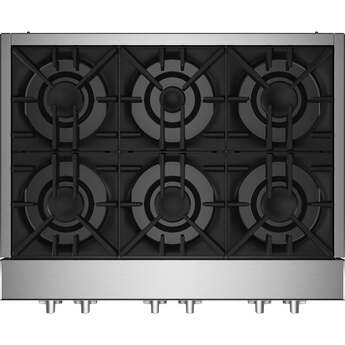 • 6 Sealed Burners, Continuous Grates, Cast Iron Grates, Halo-Effect Knobs in Stainless Steel
