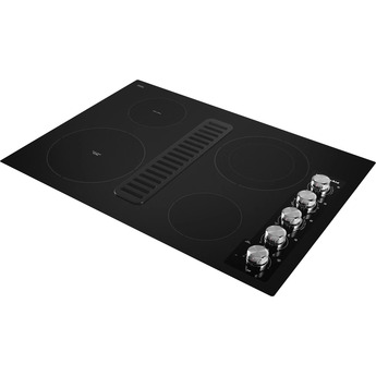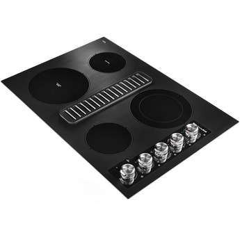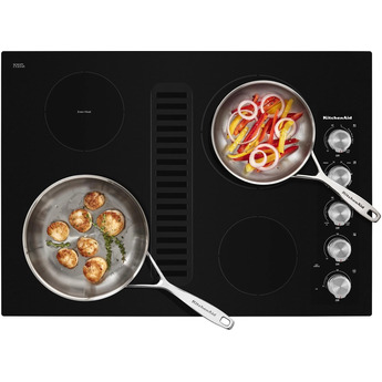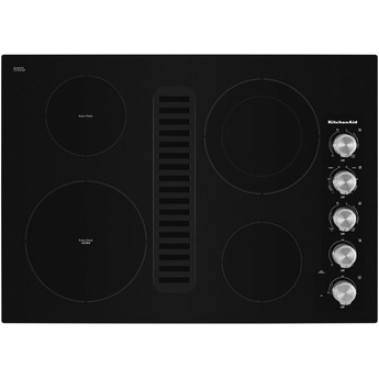 The integrated ventilation system on the KitchenAid-KCED600GBL 30" Black Smoothtop Electric Cooktop with Downdraft Ventilation affords owners to save from buying a separate range hood for their KitchenAid cooktop. This appliance maintains its beautiful sleek appearance with a Cookshield finish that protects it against scratches. Plus, stainless steel control knobs add to its eye-catching appeal. Two double-ring elements provide versatility in cooking, in addition to a 10" and 6" element, all equipped with Even-Heat Technology offering a wide range of heat options from low to high. The 300 CFM motor on the downdraft effectively clears the air while cooking with high heat.