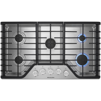 The KitchenAid-KCGS356ESS 36" Stainless Steel Sealed Burner Natural Gas Cooktop with Center Controls is a very heavy duty, versatile, well made 5 burner gas cooktop. People really like the heavy metal knobs and the continuous cast iron grates that enable you to easily move pots and pans from burner to burner. The 19K BTU Multiflame burner is quite versatile since it offers both very high and low temperatures allowing you to go from a simmer to a boil without switching burners. The electronic ignition automatically lights the burners eliminating the need for any standing pilot light and an LP conversion kit is included with the cooktop. The sleek design also makes for easy cleanup.