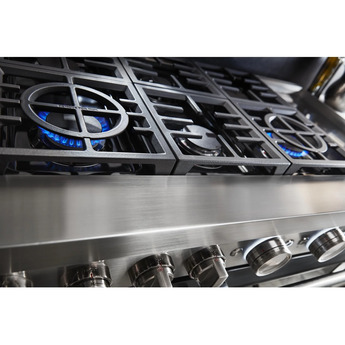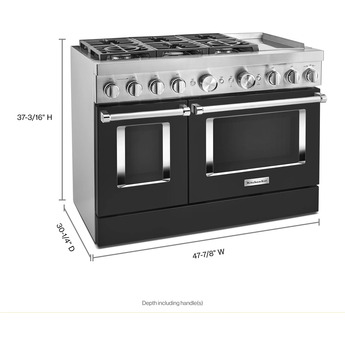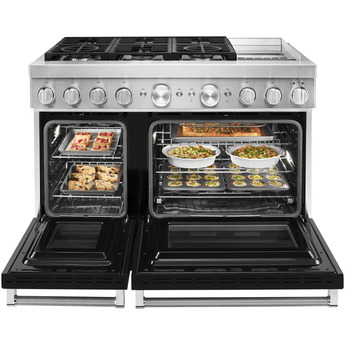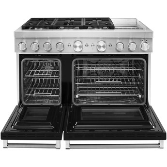 Satisfy your craving to create with a 48-inch KitchenAid Commercial-Style Range with Even-Heat Chrome Electric Griddle. This dual fuel range combines an electric double oven with a 6-burner gas cooktop. Two 20,000 BTU Ultra Power Dual-Flame Burners offer power and precision to successfully sear, simmer, stir-fry and saute?. Even-Heat True Convection helps you achieve more consistent baking and roasting.