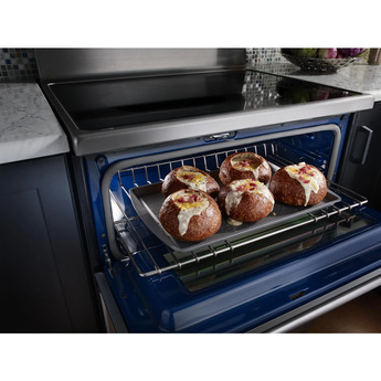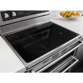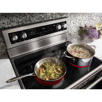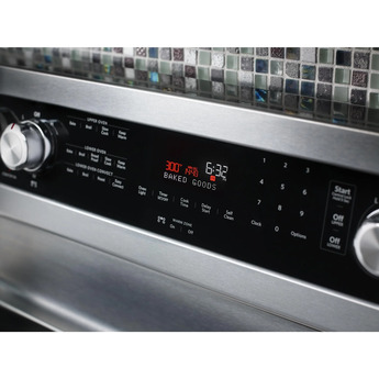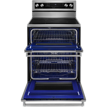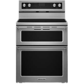 Get a wide range of cooking options with the KitchenAid-KFED500ESS 30" Stainless Steel Freestanding Electric Double Oven Range - Convection offering 5 cooking elements and a warming zone for even more versatility. This double convection oven boasts 6.7 cubic feet total in capacity so you can cook a full spread in less time. Convection cooking ensures that the entire oven is heated, from every rack to the walls to produce consistent even results for any entree. Satin glide racks also make it easy to retrieve heavy pans and pots as well. This stylish electric range is sure to please and inspire.