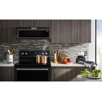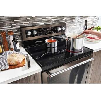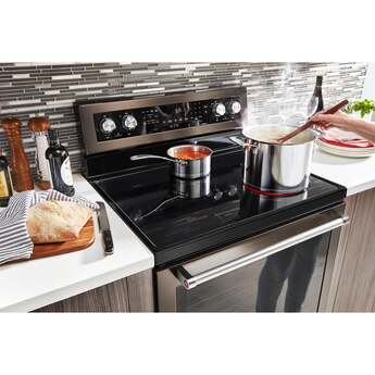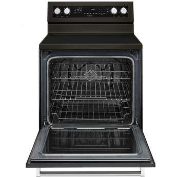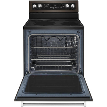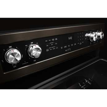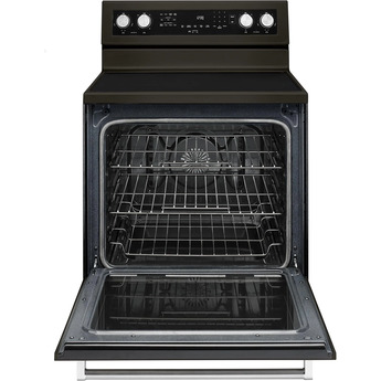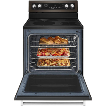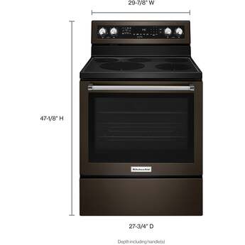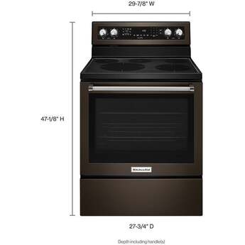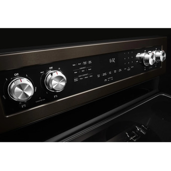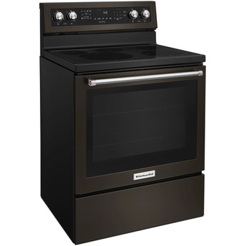 Large families enjoy using the KitchenAid-KFEG500EBS 30" Black Stainless Steel Freestanding Electric Range - Convection as multiple dishes can be prepared in the extra-large 6.4 oven capacity. Even-Heat True Convection ensures that every dish comes out cooked to perfection, as the bow-tie design and convection fan circulates heat around the entire cavity and maintains set temperatures. Five cooking elements and a warming zone on the cooking surface provide versatility with two dual fuel cooking zones. Top performance is complemented with professionally-inspired styling with satin-textured handles and a stainless steel cooktop trim.