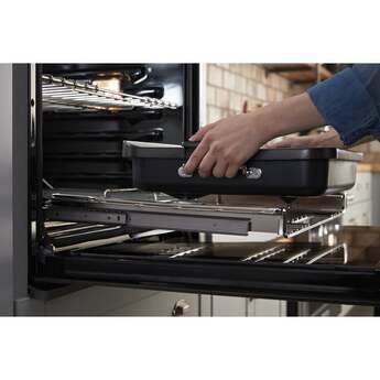 Makes it easier to cook with large or heavy bakeware. Sure-grip handle and smooth roll-out simplify loading and unloading. Lower-oven rack is designed to hold the attachment base pan securely in place during use, yet allows easy pan insertion and removal.