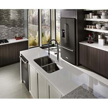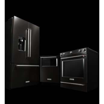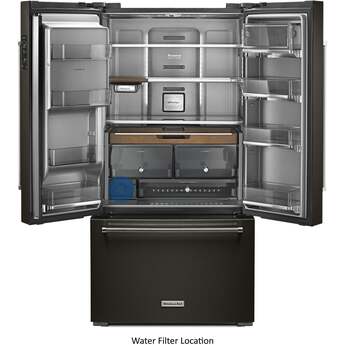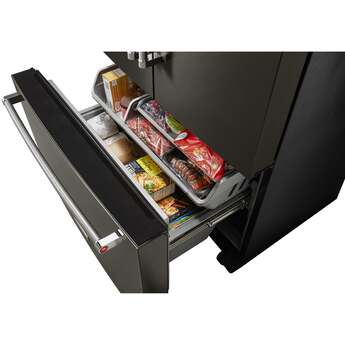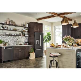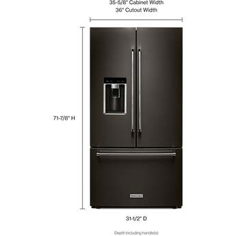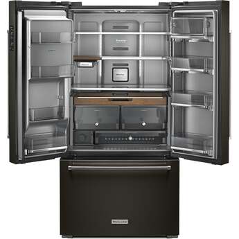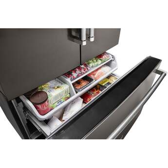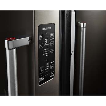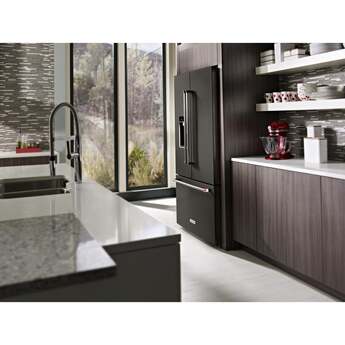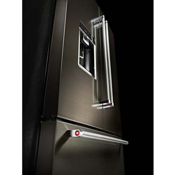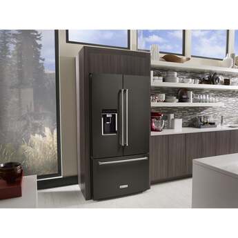 The Printshield finish on the KitchenAid-KRFC704FBS 36" 23.8 cu. ft. Black Stainless Steel Counter-Depth French Door Refrigerator with PrintShield Finish keeps the exterior looking new with its smudge and fingerprint proof coverage. Quickly find exactly what you're looking for with clear door bins that provide exceptional visibility inside, plus 8 gallon door bins and 4 shelves to easily organize contents. In the freezer, find three drawers and two bins to store and easily access frozen goods. Allow this beautiful French door refrigerator to enhance your kitchen design.