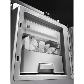 Adds interior room in the refrigerator with an ice bin that mounts on the inside left door of the refrigerator, keeping it out of the refrigerator compartment and allowing for extra shelf space.