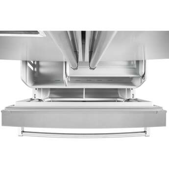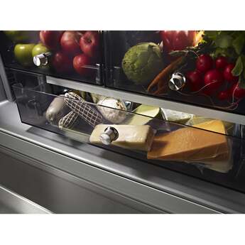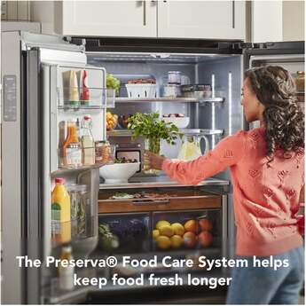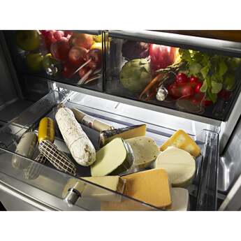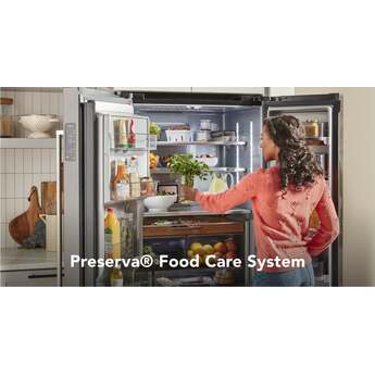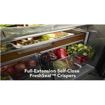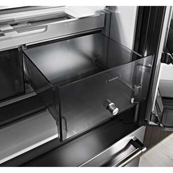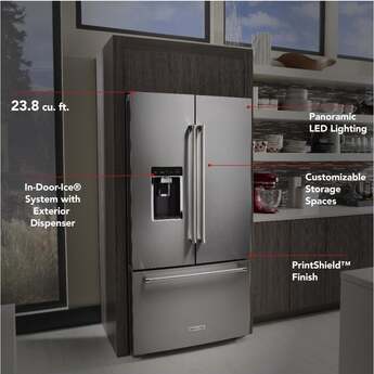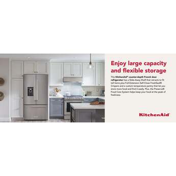 Capitalize on space with the KitchenAid-KRFC704FPS 23.8 Cu. Ft. Stainless Steel Counter Depth Refrigerator With PrintShield Finish. It's the perfect size for a scaled down, moderately sized kitchen. Even though it is counter depth, it has nearly 24 cubic feet of refrigerator and freezer space and it is amazing how many groceries will fit inside. The PreservaFood Care System gives the refrigerator and the freezer their own separate cooling systems to keep food fresh. The In-door ice and water feature is especially convenient for active households. Full extension drawers open easily, and you can see what is in all the drawers without having to open them. Another big selling point is the PrintShield finish that resists fingerprints and is easy to clean. KitchenAid delivers top performance and quality with the KRFC704FPS
