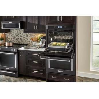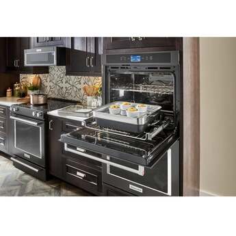 The oven capacity on the KitchenAid-KSEG700EBS 30" Black Stainless Freestanding Electric Range - Convection is extremely large! At 6.3 cubic ft. you can easily prepare multiple dishes at once. The steam rack adds extra moisture making for better cooking results. The cooktop is very versatile with five burners, including a triple burner, 6", 9", and 12", plus a warming zone. The EasyConvect Conversion feature takes the guesswork out of changing traditional recipes to convection cooking. The AquaLift feature cleans your oven at much lower temperatures in less than an hour, using less energy and with none of the odors of self-cleaning. The glass touch controls are easy to clean and easy to use. There is also an optional side trim accessory kit to get a clean, streamlined look.