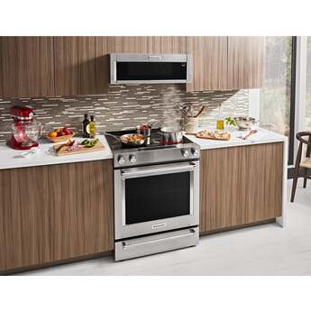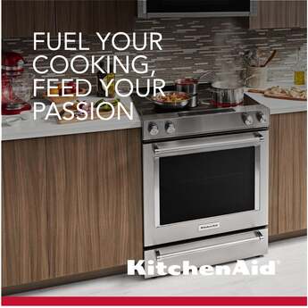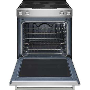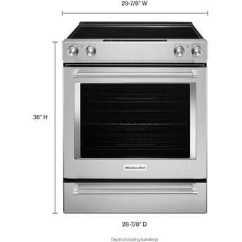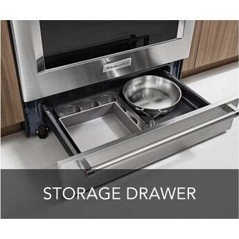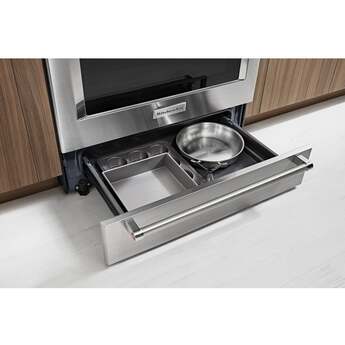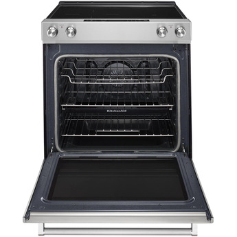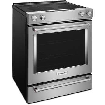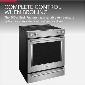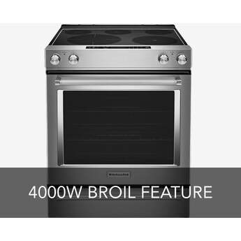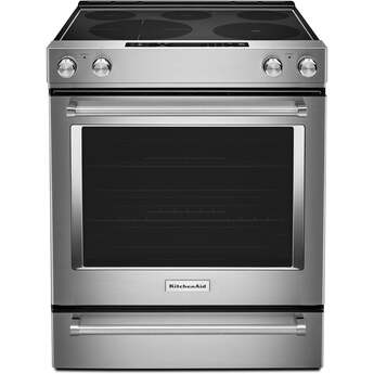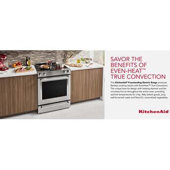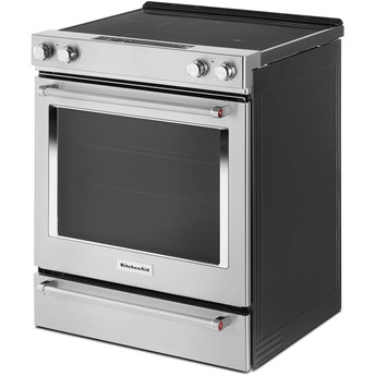 Simple and sleek in design, the KitchenAid-KSEG700ESS 30" Stainless Steel Slide-In Electric Range - Convection is a powerful addition to your kitchen suite. Decked with 5 cooking elements and a warming zone, this range offers an abundance of versatility and style. The large 6.4 cu. ft. oven capacity affords users to cook multiple dishes simultaneously, while Even-Heat True Convection ensures that they all come out perfect. Use the steam rack for added moisture. Plus, a storage drawer conveniently holds your pots, pans and baking cookware. Finally, a simple self-clean cycle runs for less than an hour and with low temperatures.
