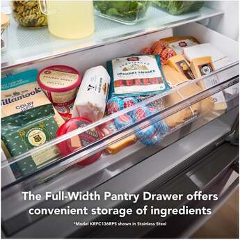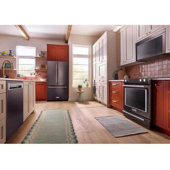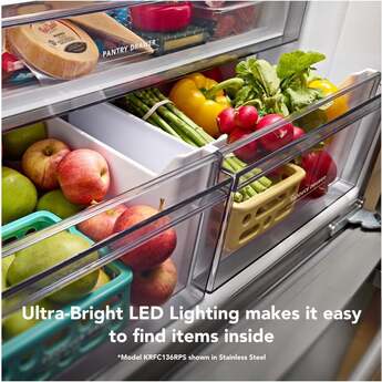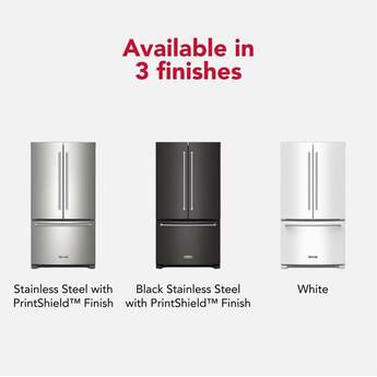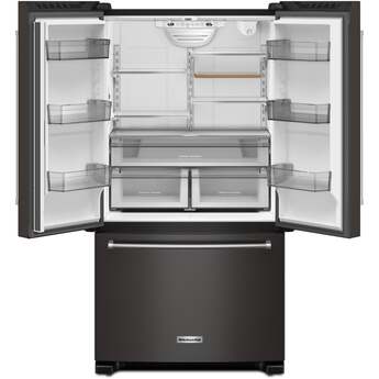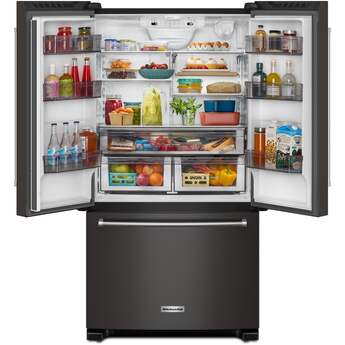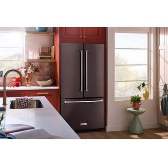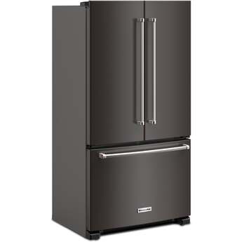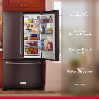 KitchenAid 36 Inch Freestanding Counter-Depth French Door Refrigerator with 20 Cu. Ft. Total Capacity, Interior Water Dispenser, Ice Maker, Spill-Resistant Framed Shelves, Wood-Look Nesting Shelf, Ultra-Bright LED Lighting, ExtendFresh? Temperature Management System and ENERGY STAR  Certified: Black Stainless Steel with PrintShield Finish
