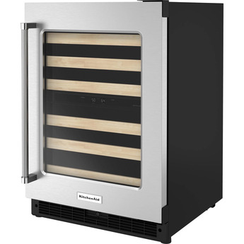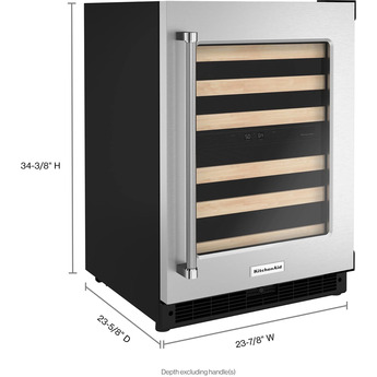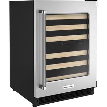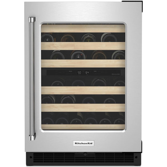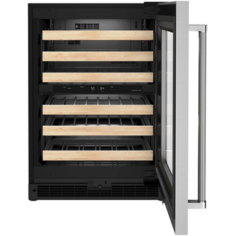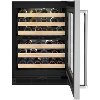 - 46 Bottle Capacity, Right Hinge, Glass Door, 6 Extension Wine Racks, Digital Control, LED Light, Compressor Cooling, SatinGlide Wood-Front Racks, Motion Activated LED Lighting, Star-K Certification, Automatic Defrosting in Stainless Steel