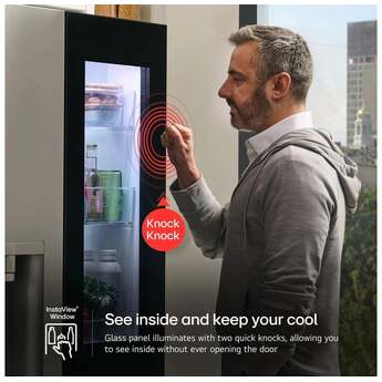 Combining innovation and distinctive design, the InstaView Door-in-Door refrigerator will enhance even the most beautifully crafted kitchen. The sleek tinted glass panel illuminates with two quick knocks, so you can see inside the easy access compartment without opening the door, reducing cold air loss to help keep food fresher longer.