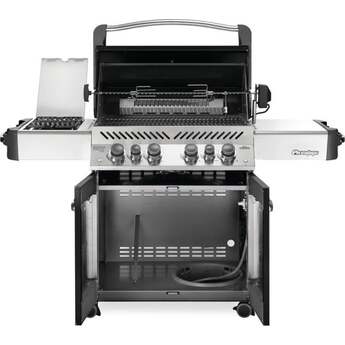 The Napoleon Prestige 500 Propane Gas Grill with Infrared Side and Rear Burners is the total grilling package; with a stunning porcelain enamel grey hood and stainless steel construction, this cart model has the capabilities of a full outdoor kitchen. With four main burners, an infrared rear and side burner, this grill can cook meals using eight unique cooking styles. Grill for a crowd with a capacity for up to thirty hamburgers, and up to eight more on the side burner. You'll know it's a Napoleon with the Iconic WAVE cooking grids for those distinctive sear marks. Not just durable on the outside; under the lid, is the same quality stainless steel used for the basin, tube burners, dual-level sear plates, and cooking grids. Seven stainless steel sear plates provide extra surface area for any drippings from your food to vaporize, avoiding flare-ups. Never leave your barbecue on again as all the Prestige series grills come with the SafetyGlow Feature where the control knobs glow red when the burner is on.