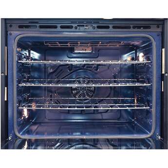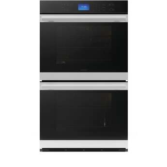 This double wall oven by Sharp comes with 5 cu. ft. capacity per cavity for a total of 10 cu. ft. total capacity. It also features 5 chrome racks, blue porcelain interior, halogen lighting, glass touch control panel, self-cleaning and true European convection.