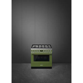 Life is fine with the Portofino, a five-burner, 4.5 cu. ft. Smeg-CPF36UGGOG Portofino Pro-Style 36" Olive Green Slide-In Natural Gas Sealed Burner Range - Convection. Safety comes first in this range, with gas safety valves up-top and an air-cooled (and soft-closing) removable door to prevent burns, pinches and overheating. Its robust stovetop, with full-width continuous cast-iron grates, cranks from 4,500 BTU to 20,000 BTU; an LP gas conversion kit tags along for added convenience. Meals practically prepare themselves thanks to triple-convection cooking, four modes, adjustable thermostat, two chrome shelves and five positions, and quick-clean enameled interior cavity.