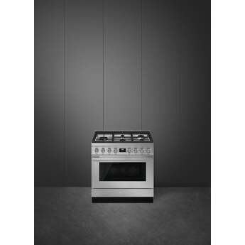 The full-width, continuous grate design of the Smeg-CPF36UGGX Portofino Pro-Style 36" Stainless Steel Slide-In Natural Gas Sealed Burner Range - Convection model make it easy for people to slide heavy cookware across the surface without lifting it. Furthermore, the four cooking modes for the gas oven provide plenty of choices for preparing meals as desired. A programmable timer and touch-sensitive display also simplify setting time-based specifics. The carefully engineered oven door stays cool on the outside to prevent burns, too.