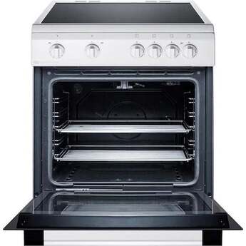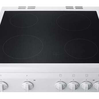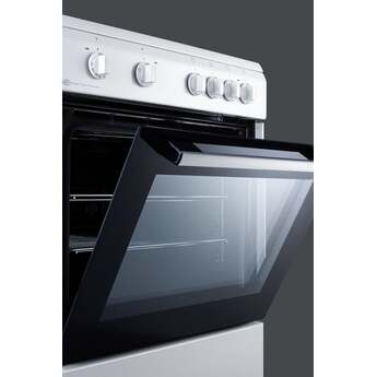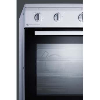 Made in Europe, the CLRE24WH is a 24" wide 220V electric range with a smooth Schott ceramic glass surface for safer heating with easy cleanup. Two 7.5" burners and two 6" burners accommodate a variety of cookware sizes. All push-to-turn cooking controls are located upfront, eliminating the danger of reaching across the cooktop surface. Indicator lights illuminate when the burners and oven are on for added kitchen safety. This unit features a 'slide-in' look without a backguard, ideal for integrating the stove into your own wall or backsplash design.