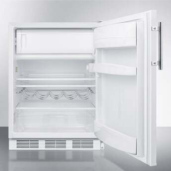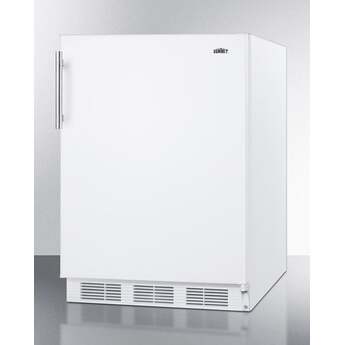 Sized with a 24" footprint, CT661WBI refrigerator-freezer offers a generous 5.1 cu.ft. storage capacity, a larger interior than many units in this size class. The front-breathing design allows built-in installation under counters, while the fully finished cabinet also enables freestanding use. This unit comes in a white exterior finish with a stainless steel handle. The user-reversible offers added flexibility.