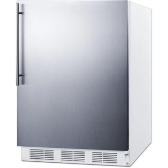 Sized with a 24" footprint, CT661WBISSHV refrigerator-freezer offers a generous 5.1 cu.ft. storage capacity, a larger interior than many units in this size class. The front-breathing design allows built-in installation under counters, while the fully finished cabinet also enables freestanding use. This unit comes with a white cabinet and stainless steel wrapped door. A thin vertically mounted handle in brushed stainless steel completes the elegant look.