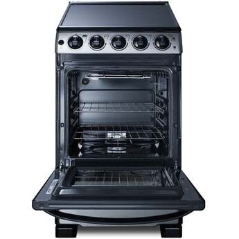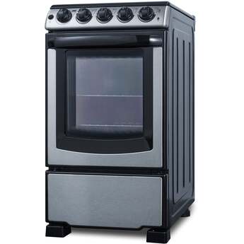 The REX2071SSRT is a 220V electric range sized at just under 20" wide. The front manifold, oven door, and lower panel feature a stainless steel finish, with a black trimmed oven window and handle for a modern look. The versatile design includes a removable 2" high stainless steel backguard, allowing you the choice of a standard range style or a slide-in look with a flat surface that allows you to better integrate the unit with your own backsplash design.