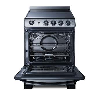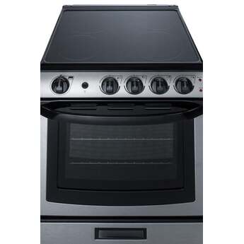 The smooth ceramic glass surface includes two 2000W elements to accommodate larger pots and pans, as well as two standard 1500W elements and a hot surface indicator light for added safety. Inside, the REX2451SSRT features a large 2.9 cu.ft. oven made from durable porcelain enamel. The waist-high broiler function is easy to use, with slide-out oven racks that can be adjusted in four different glide positions for the best fit. We include a small two-piece porcelain broiler tray with a grill cover. The large oven window and interior light make it easy to monitor your cooking.