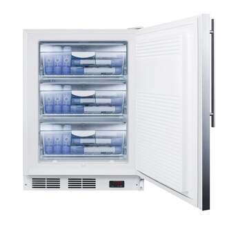 The Summit VT65ML7BISSHVADA 3.5 Cu. Ft. Stainless Steel Built-In Capable Compact Freezer has a height of 32 inches, fits under ADA height compliant counters, and is commercially approved. Its flexible design allows this unit to be used freestanding or built in. This unit is capable of reaching -25 degrees C, has three slide-out drawers for storage, and has an adjustable thermostat to regulate and maintain temperatures. The one piece interior liner and stainless steel finish make it easy for users to clean this appliance.