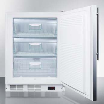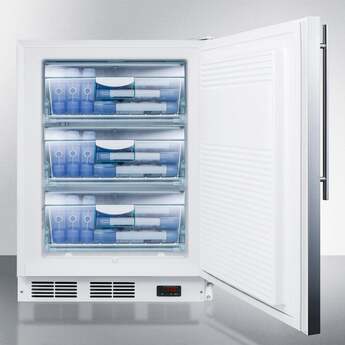 AccuCold VT65MADA medical all-freezers offer low temperature storage in a perfectly sized footprint designed freestanding use in ADA compliant settings. The 32" high VT65MLSSHVADA has a 24" footprint and is designed for freestanding use, with low temperature manual defrost operation that can reach -25ºC. The interior includes three slide-out basket drawers for convenient storage that keeps items cold when the door is opened. Additional features include an adjustable thermostat and one-piece interior liner for easier cleanup. This medical unit has a white cabinet and 304 grade stainless steel wrapped door. A factory installed lock offers added security and a sleek stainless steel handle completes the look. NOTE: ALL VT65M FREEZERS ARE DESIGNED FOR MEDICAL OR COMMERCIAL USE ONLY. THESE ARE NOT HOUSEHOLD FREEZERS.