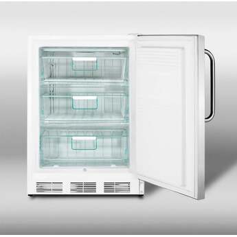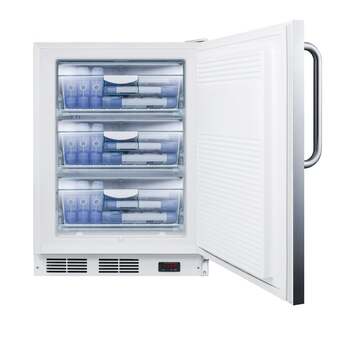 AccuCold VT65MADA medical all-freezers offer low temperature storage in a perfectly sized footprint designed freestanding use in ADA compliant settings. The 32" high VT65MSSTBADA has a 24" footprint and is designed for freestanding use, with low temperature manual defrost operation that can reach -25ºC. The interior includes three slide-out basket drawers for convenient storage that keeps items cold when the door is opened. Additional features include an adjustable thermostat and one-piece interior liner for easier cleanup. This medical unit has a white cabinet and 304 grade stainless steel wrapped door. A factory installed lock offers added security and a curved towel bar handle completes the look. NOTE: ALL VT65M FREEZERS ARE DESIGNED FOR MEDICAL OR COMMERCIAL USE ONLY. THESE ARE NOT HOUSEHOLD FREEZERS.
