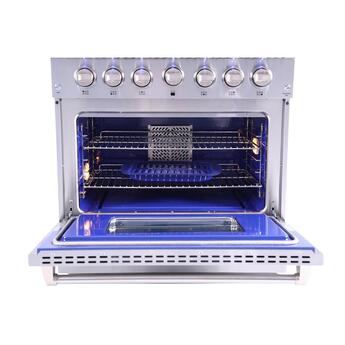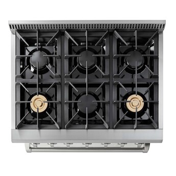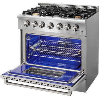 Enhance your kitchen with a luxurious and powerful range by Thor Kitchen. This freestanding gas range features 6 sealed burners, including a dual burner which offers a powerful flame and gentle simmer. Continuous grates allow you to easily slide heavy cookware across the cooktop. Cleaning up any spills on the cooktop is a breeze thanks to the porcelain drip pan. The oven offers 5.2 cu. ft. of capacity, easily accommodating a large roast. The powerful U shape stove burner provides you with 22,000 BTUs of power. The Infrared Broil burner radiates the perfect amount of heat to sear your food and seal in the juices. Best of all, the commercial quality convection fan circulates heat to maximize even, multi-rack cooking.