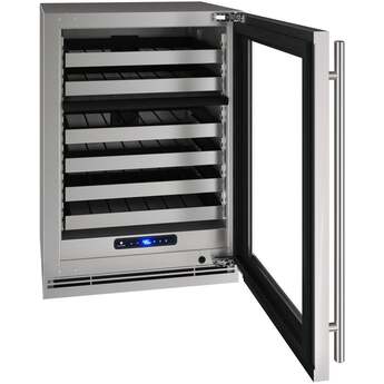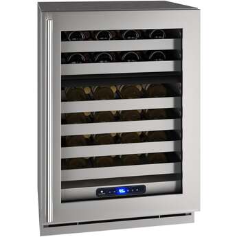 Store red and white wines in a single unit, at their optimal temperature with our 24" 5 Class Dual-Zone Wine Refrigerator is a wine lover's dream. This product features stainless steel inside and out, convection cooling for quick and consistent temperatures, and a state-of-the-art variable speed compressor. Robust and refined, U-Line's 5 Class Collection features an industry-exclusive full-depth lower interior allowing you to maximize storage space, adjustable blue and white LED lighting, and U-Adjust 17 position adjustment for full extension wine racks. This model can be built-in or used freestanding and is available with stainless steel or integrated door finishes that accept a custom door panel to match your surrounding cabinetry.