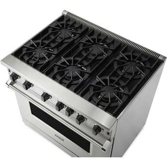 • Liquid Propane Gas, 6 Open Burners, 5.1 cu. ft. Total Oven Capacity, Convection Oven, Continuous Grates, Viewing Window, SureSpark Ignition System, Gourmet-Glo Infrared Broiler, Cast Iron Grates, ProFlow Convection Baffle, VariSimmer, BlackChrome Knobs, GentleClose Door in Slate Blue