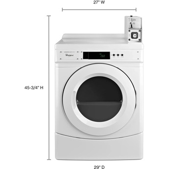 The extra-large capacity of this Whirlpool-CED9150GW 27" White Front Load Dryer Commercial Electric- Factory-Installed Coin Drop with Coin Box machine makes it easy to dry bedding and other types of hefty loads with ease. The three cycle settings handle colors and whites, along with different types of fabrics. An 84-square-inch lint screen captures debris that comes from clothes during the dry cycle and removes quickly for hassle-free maintenance between loads. The 5,600-watt electric heating element offers reliable results, too.